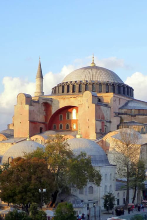 کلیسای ایاصوفیه در سبک ترکیبی پلان محوری و مرکزی، در زمان فرمانروایی ژوستینین در استانبول فعلی ساخته شده است. این بنای زیبا بین سالهای ۵۳۲ میلادی تا ۵۳۷ میلادی یعنی اوایل قرن ششم ساخته شد. پیش از ساخت ایاصوفیه، کلیسای دیگری در آنجا قرار داشت که در شورش سال ۵۳۲ که نیمی از ساختمانهای شهر قسطنطنیه نابود شدند، ویران شد. بلافاصله پس از آن یوستینیانوس به معماران خود دستور داد تا آن بنا را با طرحی با شکوهتر برپا کنند. نامهای دیگر این بنا، هاگیا صوفیه و حکمت مقدس است. معماران بزرگ این بنا آنتیموس ترالسی و اسیدروس میلو توسی نام دارند. ایا صوفیه بعد از سقوط قسطنطنیه و پیروزی عثمانیها در سال ۱۴۵۳ میلادی، با اعمال تغییراتی در ظاهر این بنا، به مسجد تبدیل شد. آنها بسیاری از موزاییکهای این مکان را خراب کرده یا روی آنها را پوشاندند. این بنا در سال ۱۹۳۵ به عنوان موزه بازگشایی شد.